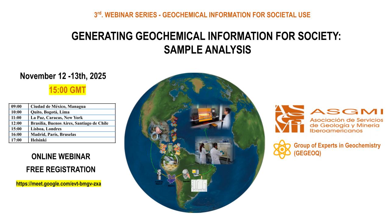 The ASGMI Geochemistry Expert Group (GEGEOQ) invites you to participate in the online workshop “GENERATING GEOCHEMICAL INFORMATION FOR SOCIETY: SAMPLE ANALYSIS”, which will take place on November 12 and 13 as part of the series “GEOCHEMICAL INFORMATION AT THE SERVICE OF SOCIETY.”